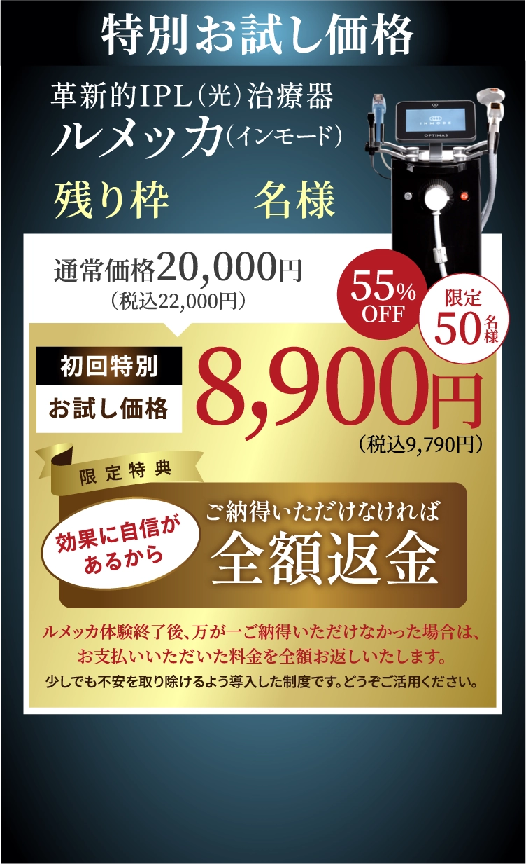 シミ・赤み・くすみの改善と キメ・ハリ・ツヤが同時に叶う ※2024.1~2024.11月にご来院いただいた方の アンケートを集計(累計回答数9467件) 濃いシミ、薄いシミ、赤ら顔 さらに、隠れたシミにも効果的 ※2024.1~2024.11月にご来院いただいた方の アンケートを集計(累計回答数9467件)