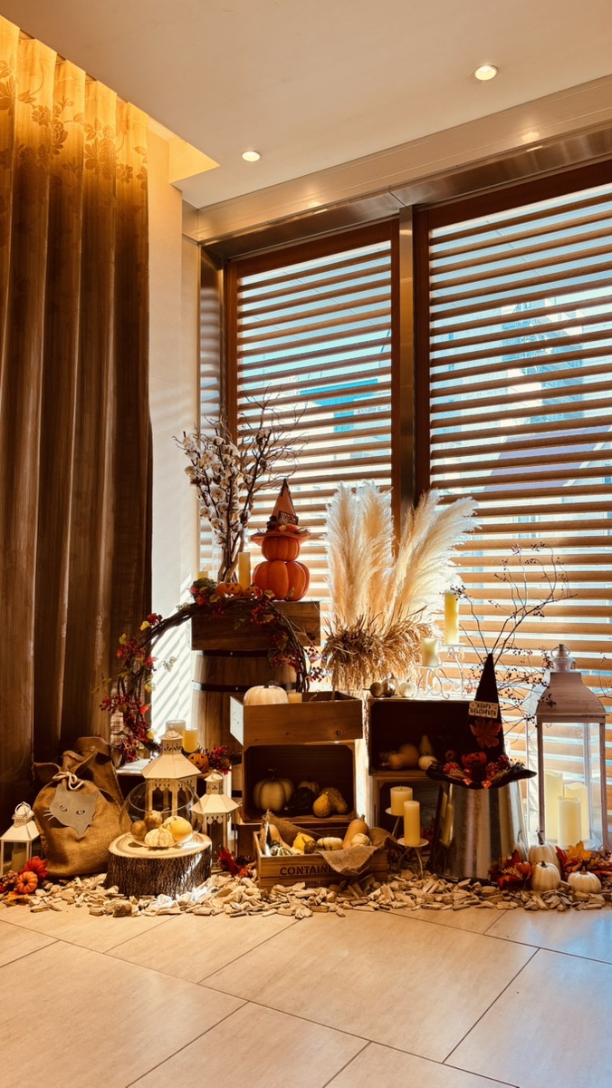 エントランスをハロウィン仕様にディスプレイしました。 秋の訪れを感じながらリラックスしていただけますように^^